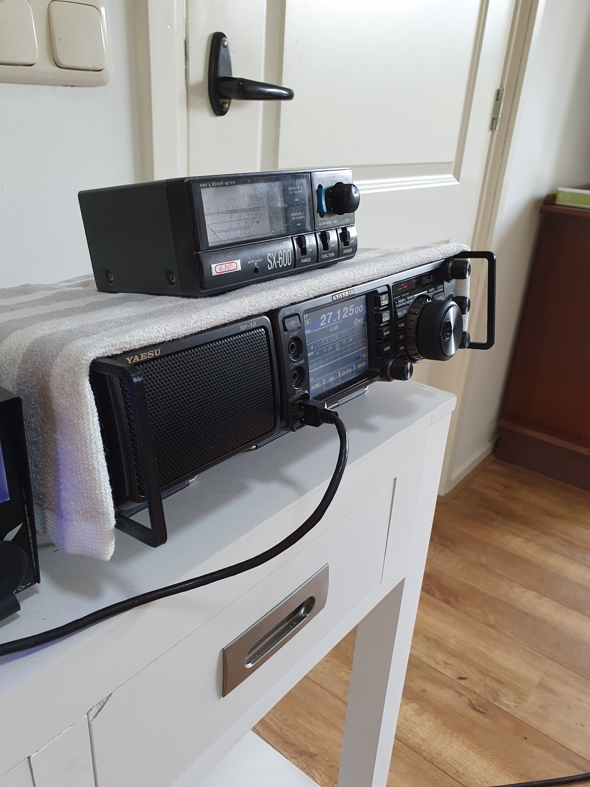 ft-991A met een speaker sp10 van yaesu daarboven een swr power meter een sx-600